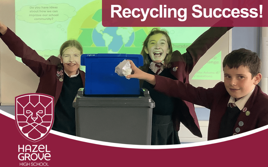 Hazel Grove High School’s Eco Council have successfully campaigned for paper recycling bins to be added to every classroom in the school. Pupils will now also be able to recycle their plastic bottles at key sites around the school grounds and in the canteens. This...